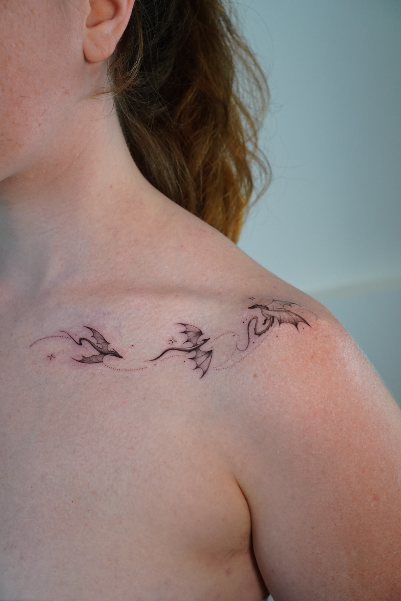 tatuaje de dragones de linea fina en el hombro