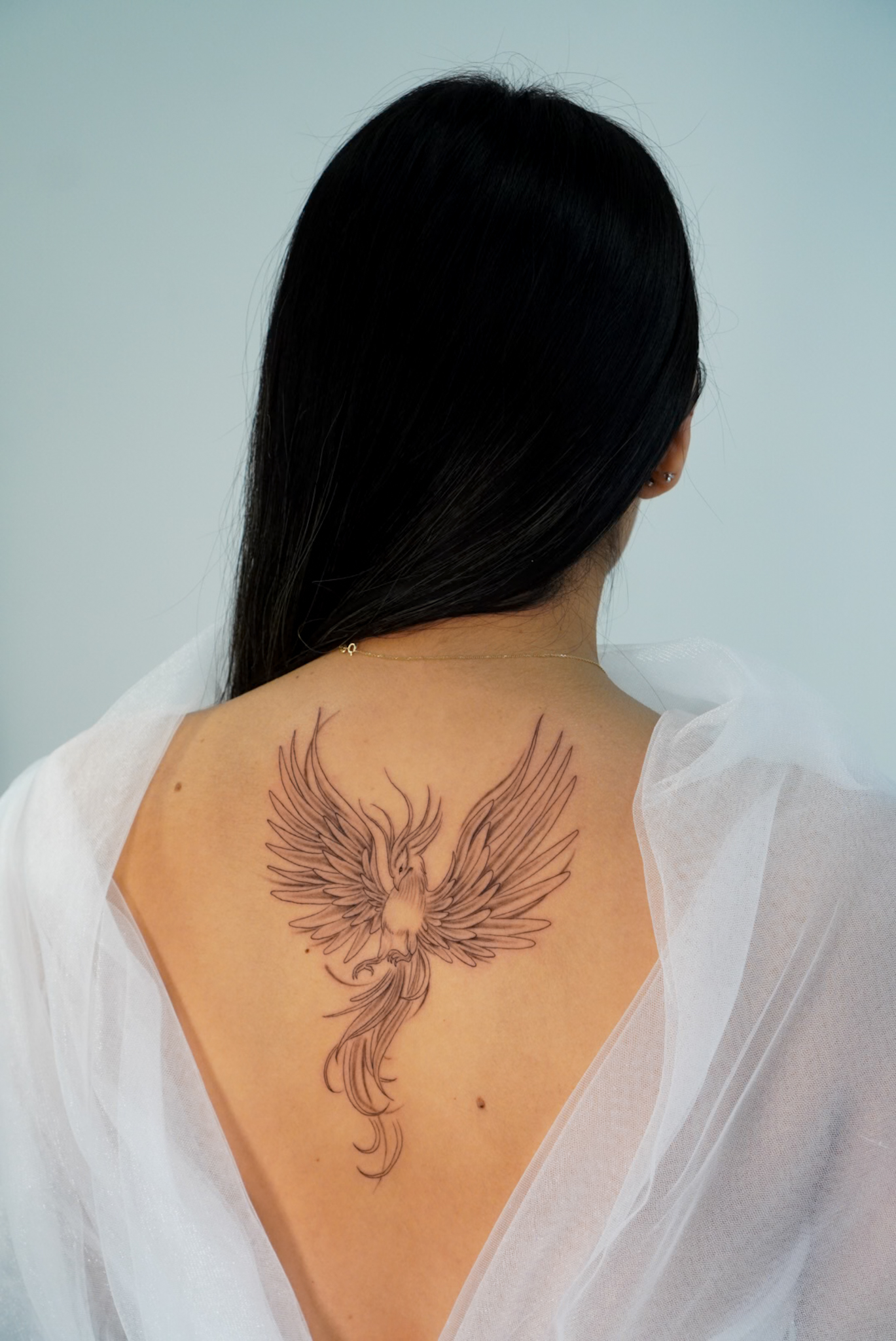 tatuaje elegante y delicado en la espalda ave fenix