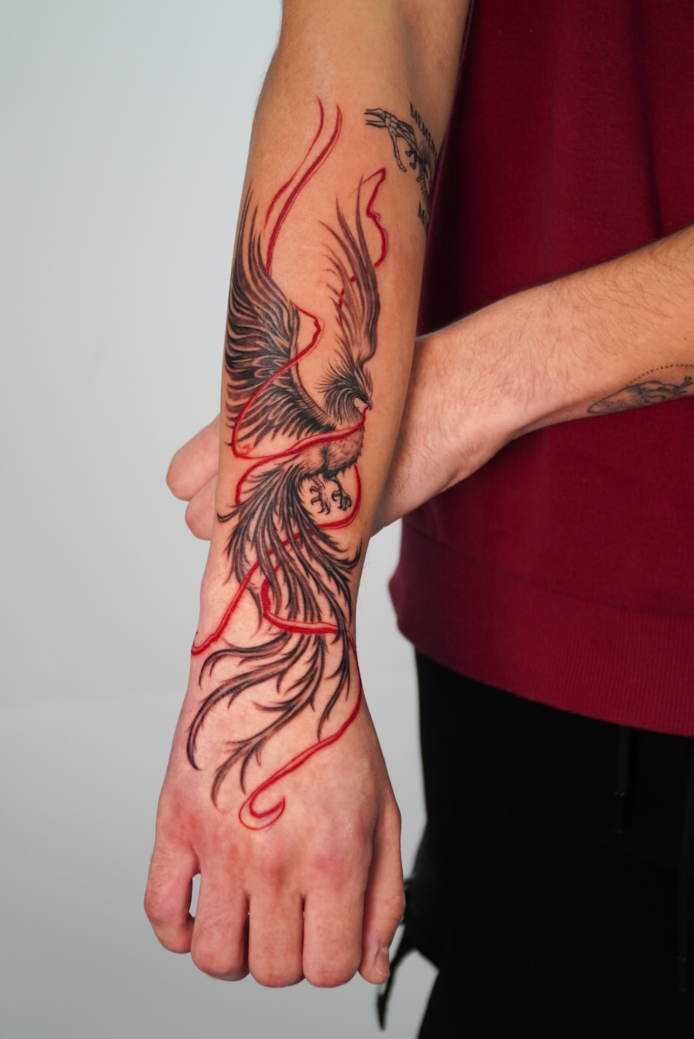 ave fénix en brazo completo a color tatuaje muy fluido logrando una gran integración en el brazo