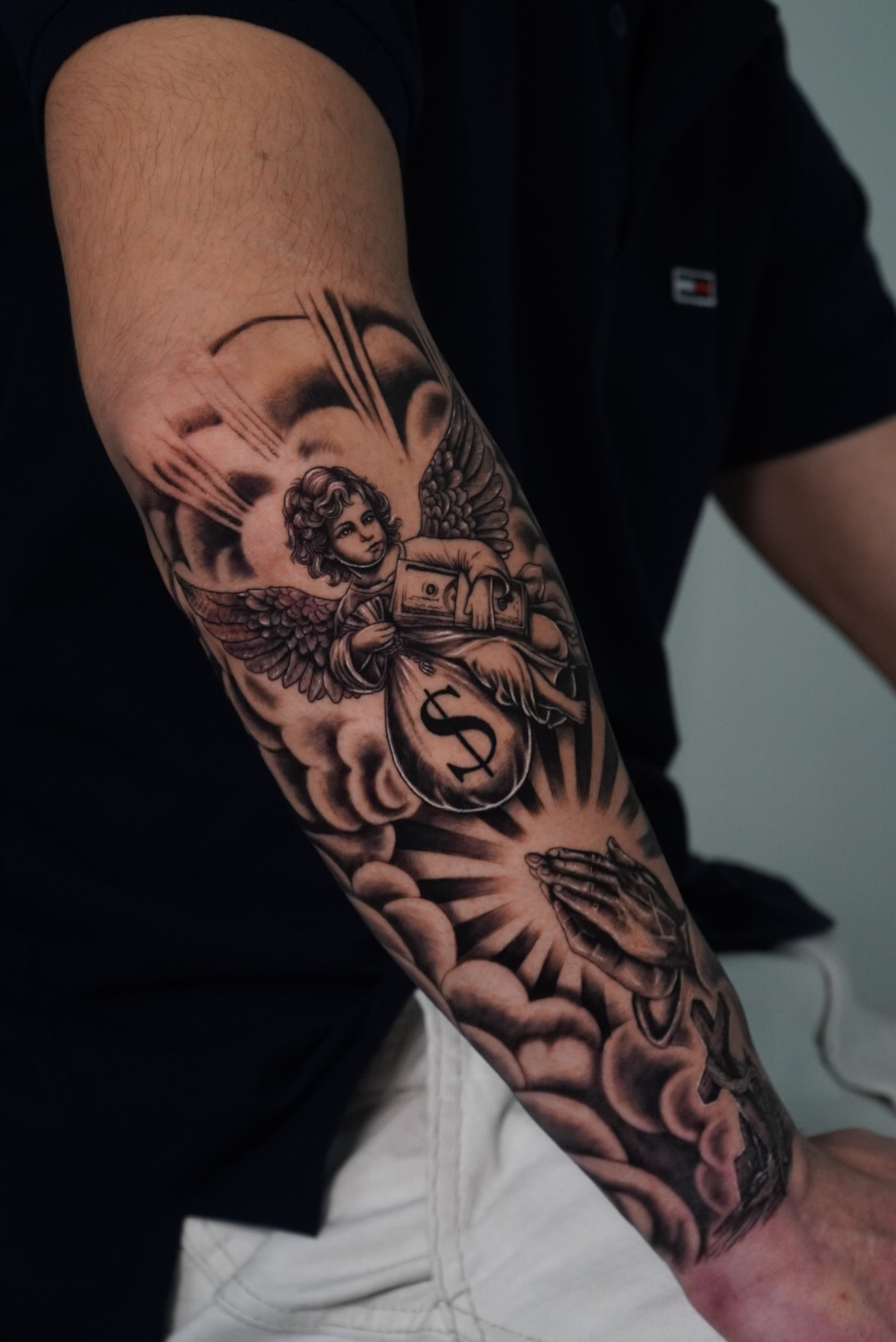 tatuaje juvenil y chicano angel con mano rezando