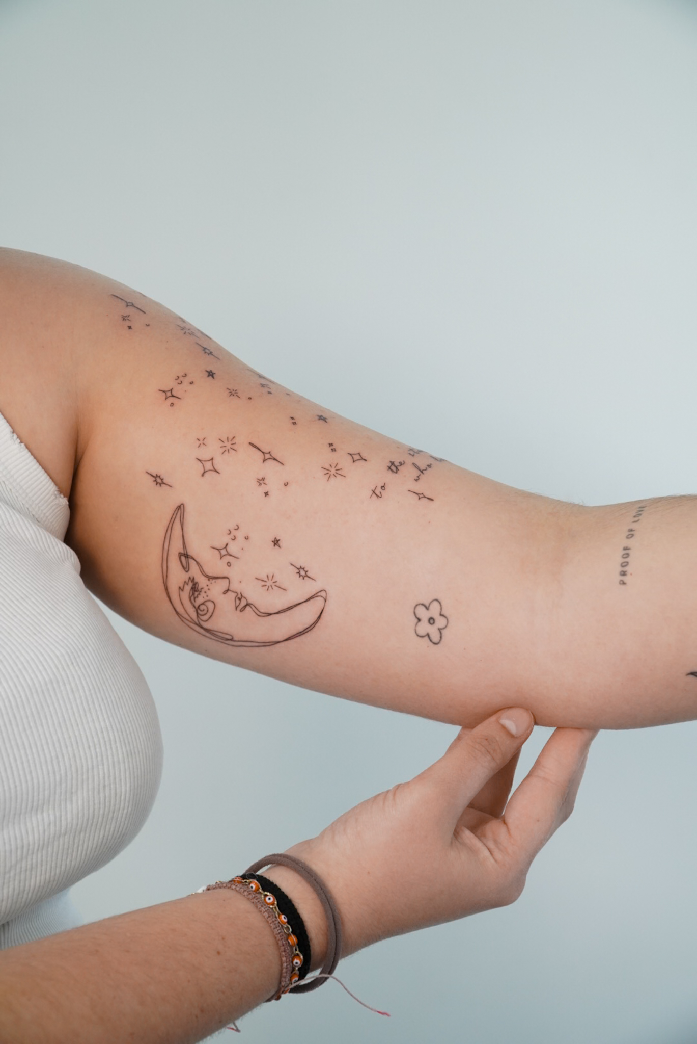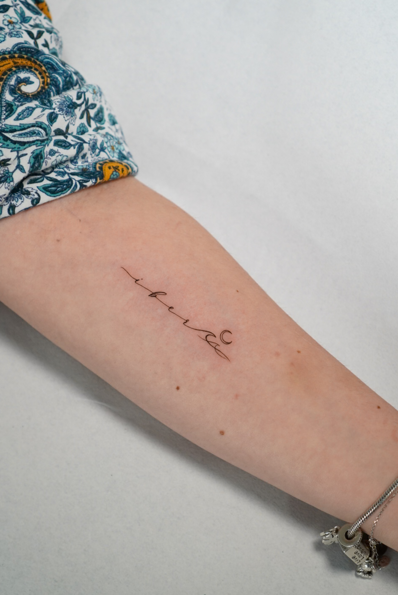 tatuaje de letras en cursivas mas elemento luna todo entrelazado logrando una pieza fina y elegante