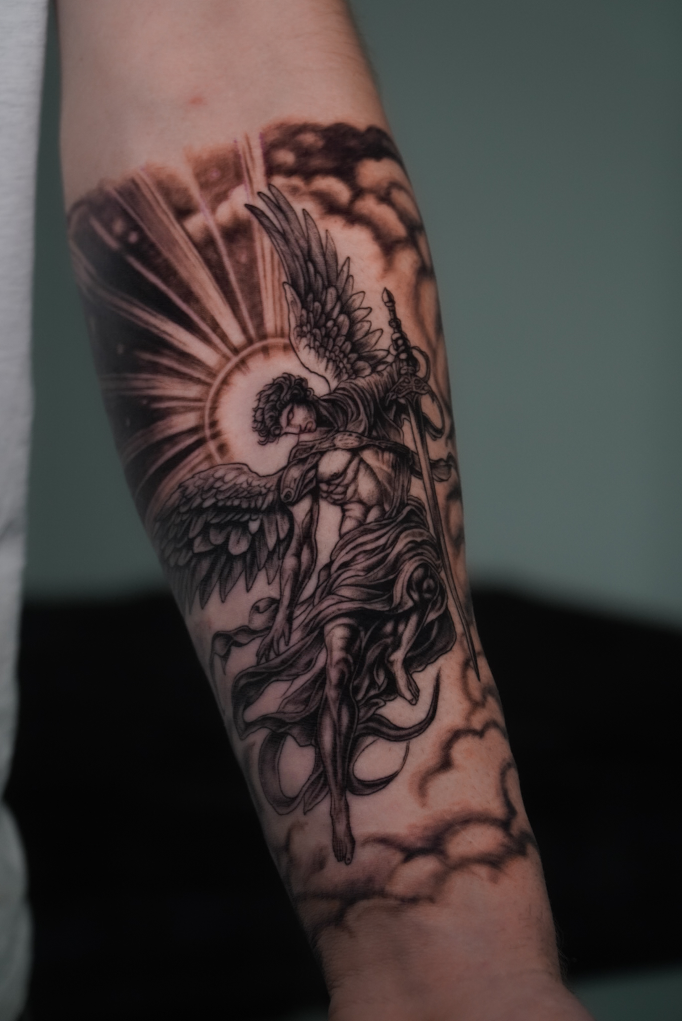 arcángel san miguel tatuaje realista en el brazo