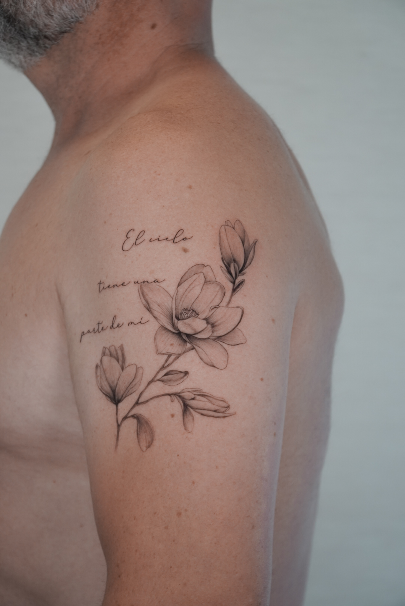 tatuaje de flor con frase con recuerdo de la flor preferida de su adre